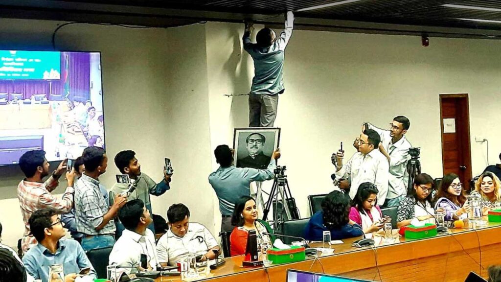 গত ১১ নভেম্বর রাষ্ট্রপতির বাসভবন বঙ্গভবনের দরবার হল থেকে বঙ্গবন্ধুর ছবি নামিয়ে ফেলার কথা জানান অন্তর্বর্তী সরকারের উপদেষ্টা মাহফুজ আলম।