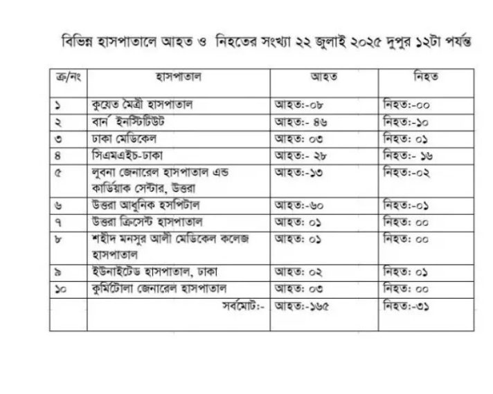 বিভিন্ন হাসপাতালে আহত ও নিহতের সংখ্যা ২২ জুলাই দুপুর ১২টা পর্যন্ত; কুয়েত মৈত্রী হাসপাতালে আহত ৮, নিহত নেই; বার্ন ইনস্টিটিউটে আহত ৪৬, নিহত ১০; ঢাকা মেডিকেলে আহত ৩, নিহত ১; সিএমএইচে (ঢাকা) আহত ২৮, নিহত ১৬; লুবনা জেনারেল হাসপাতাল অ্যান্ড কার্ডিয়াক সেন্টারে (উত্তরা) আহত ১৩, নিহত ২; উত্তরা আধুনিক হসপিটালে আহত ৬০, নিহত ১; উত্তরা ক্রিসেন্ট হাসপাতালে আহত ১, নিহত নেই; শহিদ মনসুর আলী মেডিকেল কলেজ হাসপাতালে আহত ১, নিহত নেই; ইউনাইটেড হাসপাতালে (ঢাকা) আহত ২, নিহত ১; কুর্মিটোলা জেনারেল হাসপাতালে আহত ৩, নিহত নেই। মোট আহত ১৬৫, নিহত ৩১ জন।