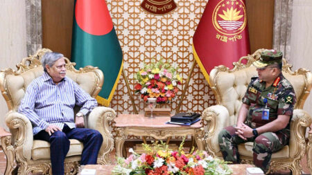 বাংলা ভয়েস ডেস্ক : সেনাবাহিনী প্রধান জেনারেল ওয়াকার-উজ-জামান রাষ্ট্রপতি মো. সাহাবুদ্দিনের সাথে সাক্ষাৎ করেছেন। আজ শনিবার (৫ অক্টোবর) সকালে বঙ্গভবনে…