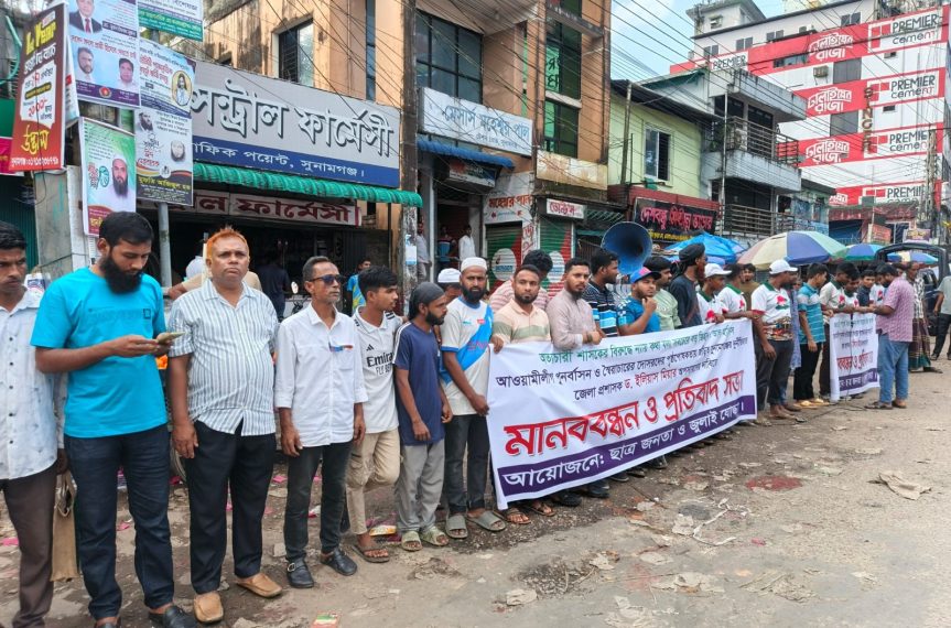 সুনামগঞ্জের দুর্নীতিবাজ জেলা প্রশাসক ড.ইলিয়াস মিয়া ও অতিরিক্ত জেলা প্রশাসক (রাজস্ব) মোহাম্মদ রেজাউল করিমকে অপসারনের দাবীতে সুনামগঞ্জে বিশাল মানববন্ধন ও প্রতিবাদ সভা অনুষ্ঠিত হয়েছে।