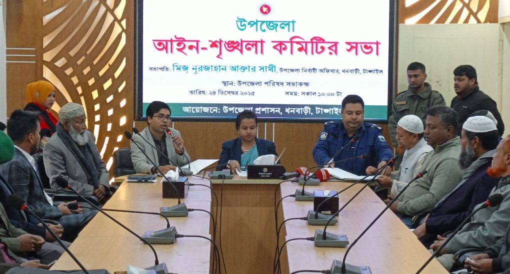 টাঙ্গাইলের ধনবাড়ী উপজেলা প্রশাসনের আইন শৃঙ্খলা কমিটির মাসিক সভা অনুষ্ঠিত হয়েছে ২৪ ডিসেম্বর বুধবার ধনবাড়ী উপজেলা পরিষদের সভাকক্ষে ।