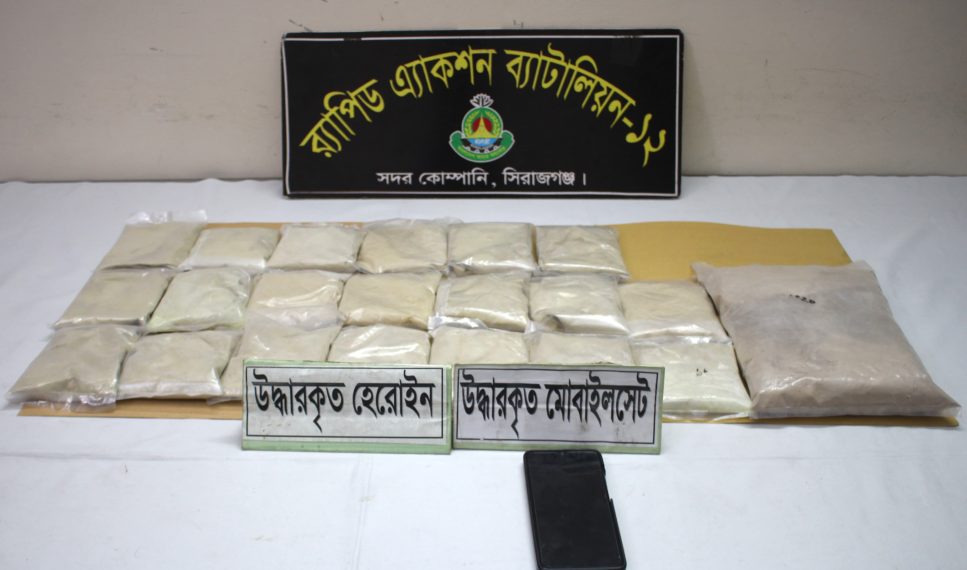 সোমবার দুপুরে গনমাধ্যমে পাঠানো এক প্রেস বিজ্ঞপ্তিতে এ তথ্য জানিয়েছে র্যাব ১২। বিজ্ঞপ্তিতে জানানো হয়, গতকাল (২২ ফেব্রুয়ারী) রাত সাড়ে ১০ টায় র্যাব-১২’র সদর কোম্পানির একটি চৌকষ আভিযানিক দল সিরাজগঞ্জ জেলার যমুনা সেতু পশ্চিম থানাধীন যমুনা সেতুর টোল প্লাজা এলাকায় একটি মাদক বিরোধী অভিযান পরিচালনা করে ৩ কেজি ৯০ গ্রাম হেরোইনসহ ০১ জন মাদক ব্যবসায়ীকে গ্রেপ্তার করতে সক্ষম হয়েছে। এছাড়াও তার সাথে থাকা মাদকদ্রব্য হেরোইন সরবরাহ কাজে ব্যবহৃত ১টি মোবাইল ফোন এবং ১টি ট্রাক জব্দ করেছে।