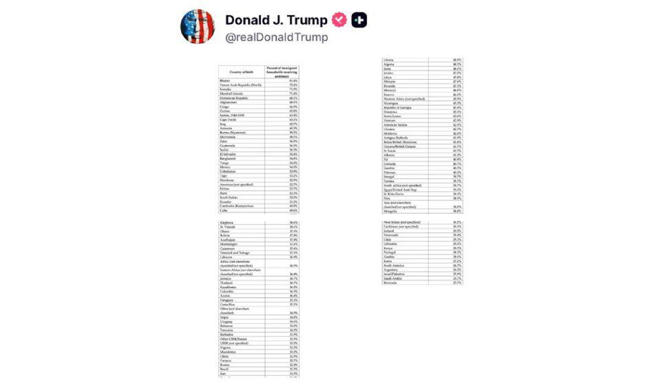 গত ৪ জানুয়ারি সামাজিক যোগাযোগমাধ্যম ট্রুথ সোশ্যালে দেওয়া এক পোস্টে ট্রাম্প জানান, যুক্তরাষ্ট্রে বিদেশে জন্ম নেওয়া অভিবাসী পরিবারগুলোর মধ্যে কত শতাংশ পরিবার সরকারি সহায়তা পাচ্ছে, সে সম্পর্কিত একটি পরিসংখ্যানভিত্তিক চার্ট প্রকাশ করা হয়েছে।