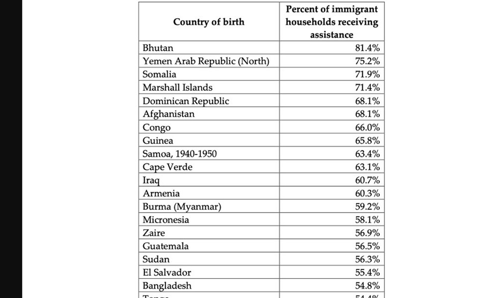 চার্টে অভিবাসীদের জন্মভূমি অনুযায়ী সরকারি সহায়তা গ্রহণের হার তুলে ধরা হয়। এতে দেখা যায়, ভুটানের অভিবাসী পরিবারগুলোর মধ্যে সর্বোচ্চ ৮১ দশমিক ৪ শতাংশ পরিবার সরকারি সহায়তা পাচ্ছে। এরপর রয়েছে ইয়েমেনি পরিবার, যাদের সহায়তা পাওয়ার হার ৭৫ দশমিক ২ শতাংশ এবং সোমালি পরিবারগুলোর ক্ষেত্রে এই হার ৭১ দশমিক ৯ শতাংশ।