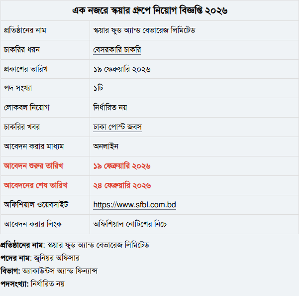 স্কয়ার গ্রুপের অঙ্গপ্রতিষ্ঠান স্কয়ার ফুড অ্যান্ড বেভারেজ লিমিটেড নিয়োগ বিজ্ঞপ্তি প্রকাশ করেছে। প্রতিষ্ঠানটির অ্যাকাউন্টস অ্যান্ড ফিন্যান্স বিভাগ জুনিয়র অফিসার পদে জনবল নিয়োগের জন্য এ বিজ্ঞপ্তি দিয়েছে। গত ১৯ ফেব্রুয়ারি থেকেই আবেদন নেওয়া শুরু হয়েছে। আবেদন করা যাবে আগামী ২৪ ফেব্রুয়ারি পর্যন্ত। আগ্রহী প্রার্থীরা অনলাইনে আবেদন করতে পারবেন। নির্বাচিত প্রার্থীরা মাসিক বেতন ছাড়াও প্রতিষ্ঠানের নীতিমালা অনুযায়ী আরো বিভিন্ন সুযোগ-সুবিধা পাবেন।