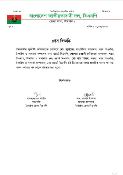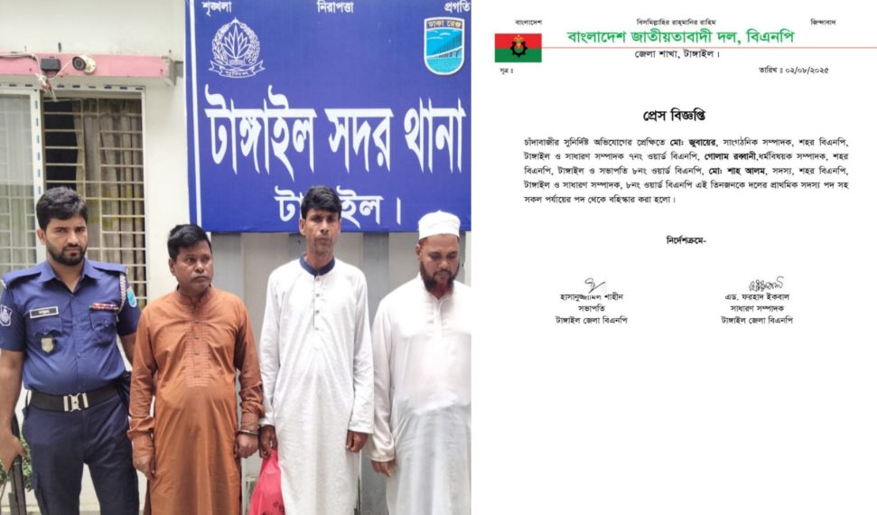 টাঙ্গাইলে চাঁদাবাজির অভিযোগে শহর বিএনপির তিন নেতাকে দল থেকে বহিষ্কার করা হয়েছে।