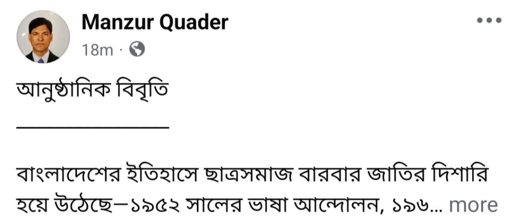 মনজুর কাদের এক ফেসবুক পোস্টে আনুষ্ঠানিক বিবৃতিতে বলেন, “বাংলাদেশের ইতিহাসে ছাত্রসমাজ বারবার জাতির দিশারি হয়ে উঠেছে। ১৯৫২ সালের ভাষা আন্দোলন, ১৯৬২ সালের শিক্ষা আন্দোলন, ১৯৬৯ সালের গণঅভ্যুত্থান এবং ১৯৭১ সালের স্বাধীনতার প্রস্তুতিতে ছাত্রদের ভূমিকা ছিল স্মরণীয়। ১৯৯০ সালে গণতন্ত্র প্রতিষ্ঠায়ও ছাত্রসমাজের নেতৃত্ব গুরুত্বপূর্ণ ভূমিকা পালন করেছে।”